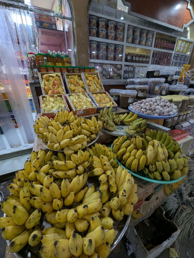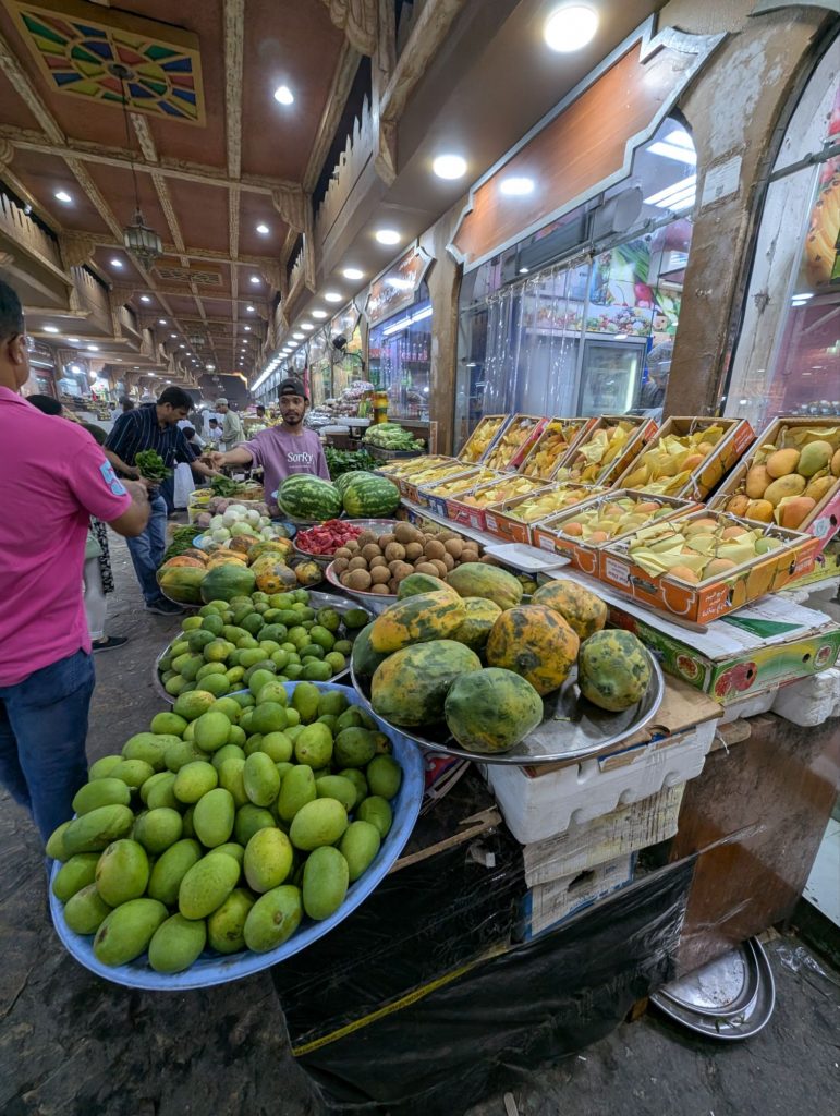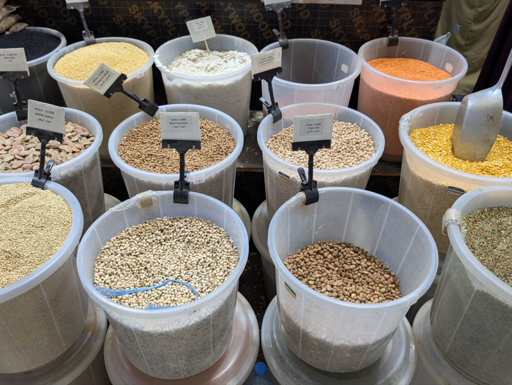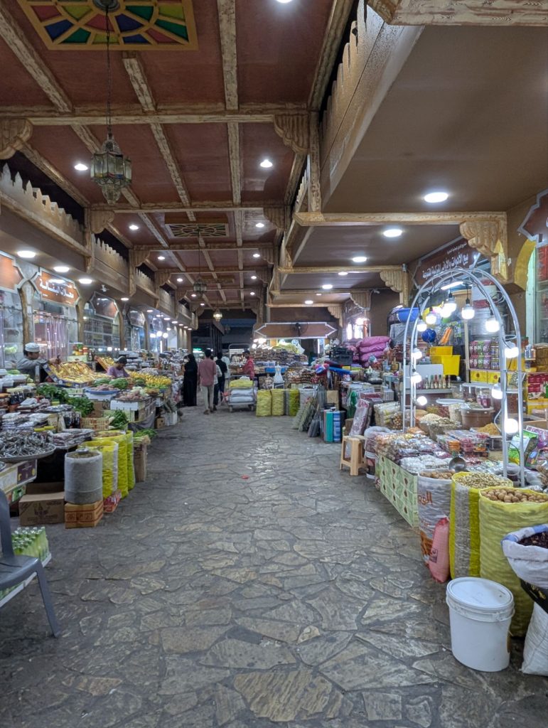 Im alten Souq gab es dann auch Obst und Gemüse, getrockneten Fisch, Gewürze, Weihrauch, Parfum, Kleidung und viele andere Dinge. Bei den Gewürzen stand ein Ventilator zu nah an Pfeffer – einige Leute mussten dort niesen. Es war heute unheimlich viel Verkehr und es war nicht so schön, Auto zu fahren.
