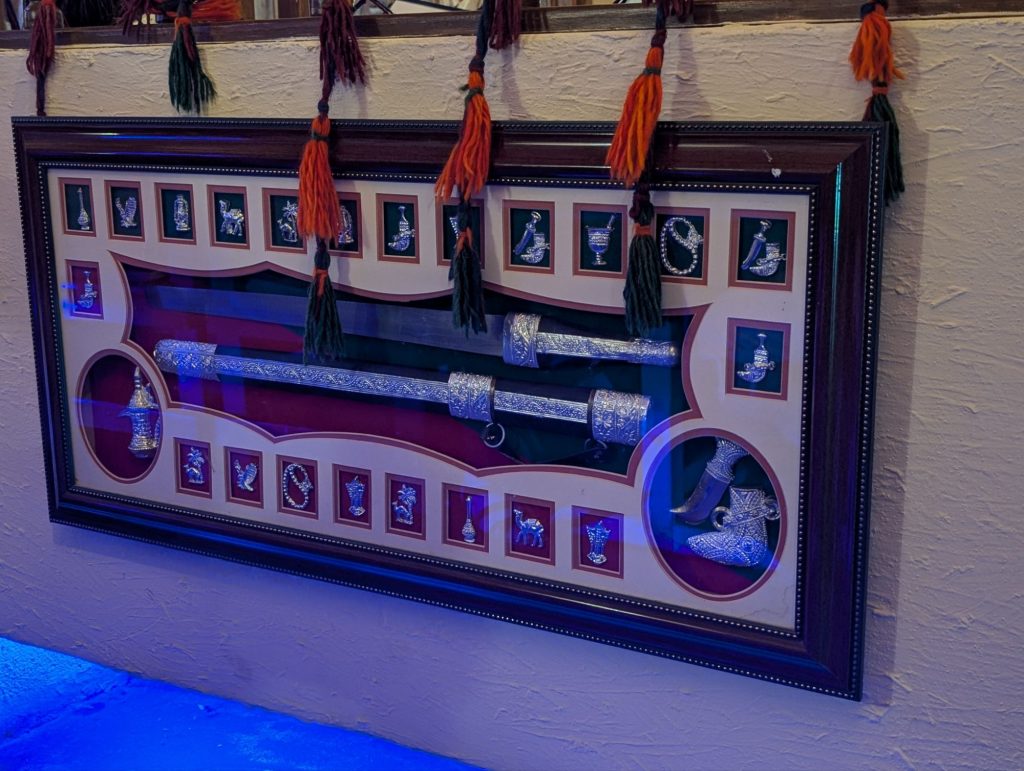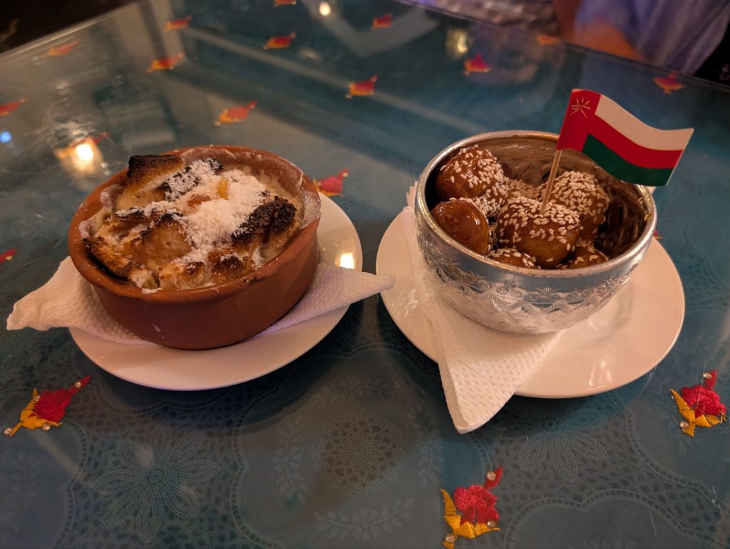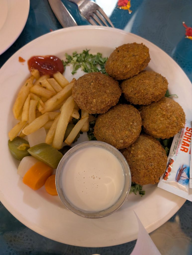 Gegessen haben wir Falafel und eine Grillplatte. Zum Nachtisch hab es Oum Ali und Luqaimat. Wir haben auch eine Limonade mit Luban probiert. Man hat den Weihrauch gerochen aber nicht wirklich stark geschmeckt.