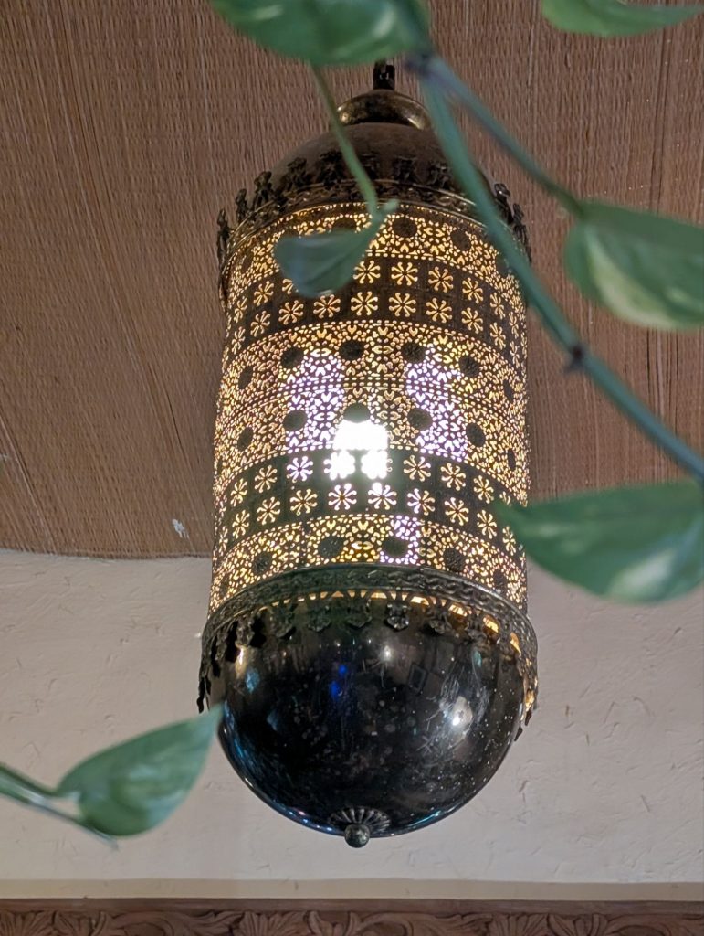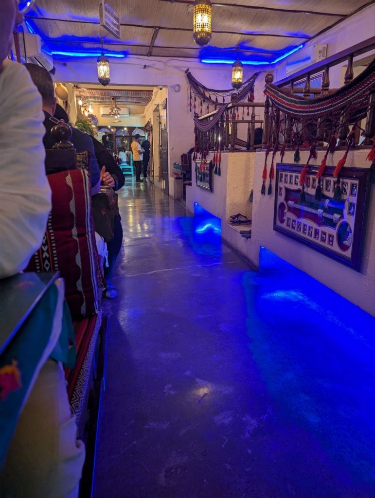 Zum Abendessen wollten wir zu einem Restaurant in der Nähe des Hotels, aber da gab es keine Grillplatte, also mussten wir etwas anderes suchen und sind zum Ramssa Omani Restaurant gefahren. Es hatte eine schöne Einrichtung und einen Käfig mit Wellensittichen. Die konnte man sich aber nicht aussuchen, wie bei Fischen oder Hummern in manchen Lokalen üblich.
