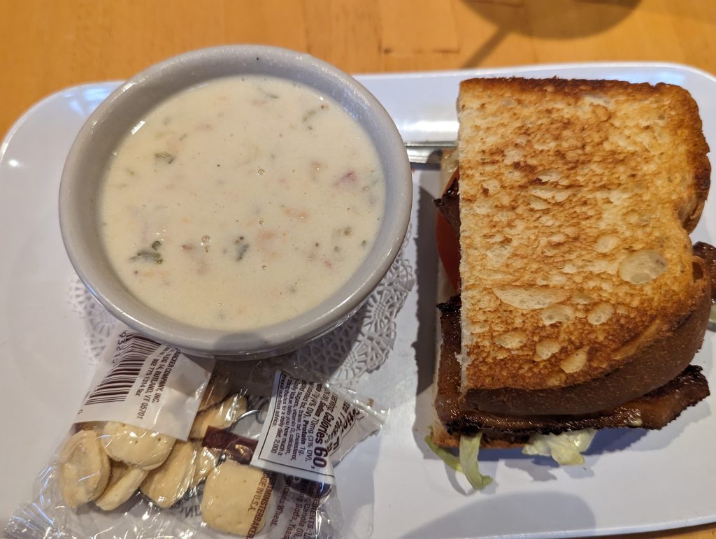 Wenn man nicht immer Burger essen will ist Clam Chowder zu empfehlen – eine amerikanische Muschelsuppe, die aber eher in den Neu England Staaten zu verorten ist – dazu gibt es hier ein halbes BLT Sandwich und Oyster Crackers.