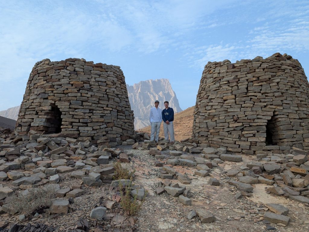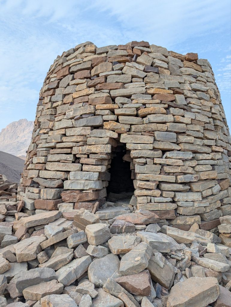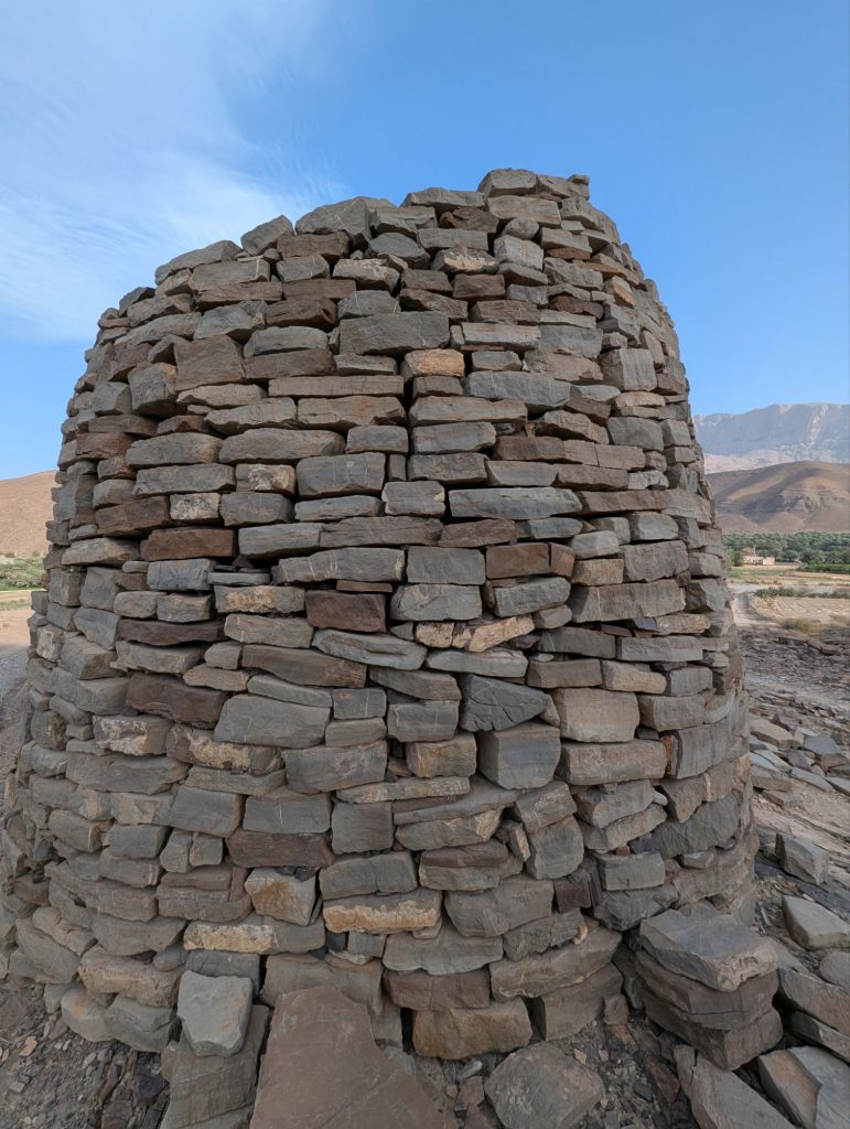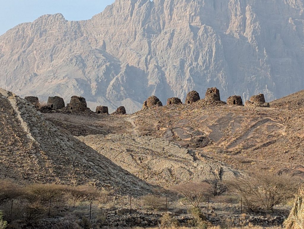 Etwa eine Stunde vor unserem Ziel liegen linkerhand die Bienenkorbgräber von Al-Ayn. Diese Grabbauten stammen aus dem 3. Jahrtausend vor Christus. Hier in den Bergen zeigt dass Thermometer zwar immer noch 39°C an, aber durch die trockenere Luft und einen kühlenden Wind fühlt es sich deutlich kühler an.