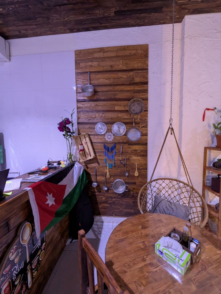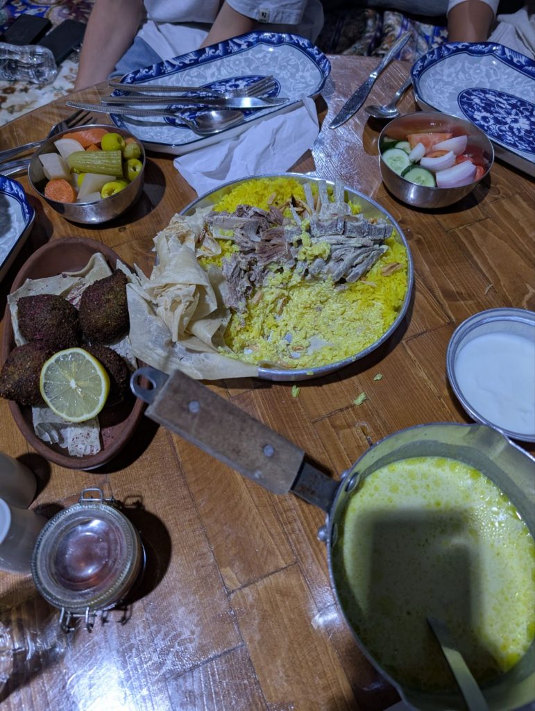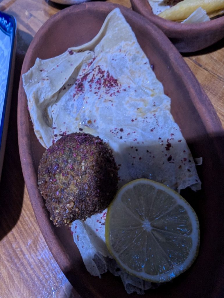 Zum Abendessen sind wir ins Beit Sitti, ein jordanisches Restaurant. Wir haben nach Empfehlung der Kellnerin Salima bestellt, die uns zwei Gerichte mit Lamm und eines mit Hühnchen empfohlen hat. Dazu gab es drei Vorspeisen (Kibbeh, Cheese Sambosa und eine Portion Pommes Frites).